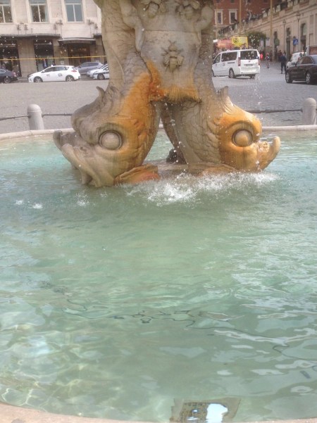 Da un esame attento si può dire, senza ombra di dubbio, che l’inclinazione della fontana verso il lato prospicente il Palazzo Barberini, si sia accentuata negli ultimi tempi. Basta osservare con attenzione le bocche dei due delfini nella foto che segue: