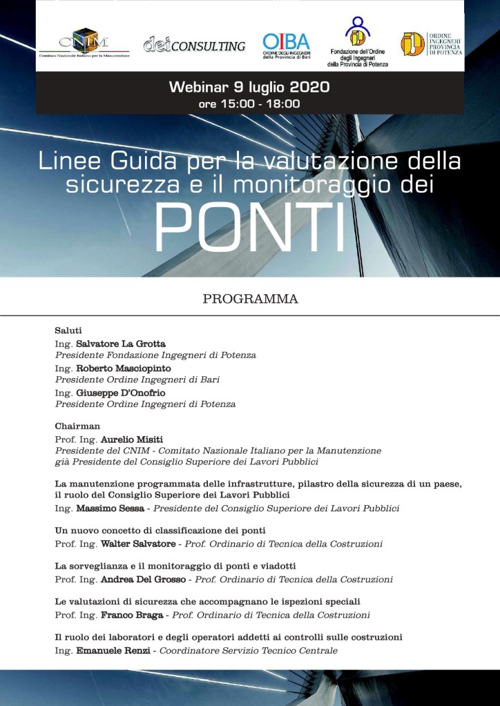 Il 09.07.2020 si è tenuto il webinar Linee Guida per la valutazione della sicurezza e il monitoraggio dei PONTI promosso dal CNIM in collaborazione con DEI Consulting, l’Ordine degli Ingegneri della Provincia di Bari, Fondazione dell’Ordine della Provincia di Potenza e l’Ordine degli Ingegneri della Provincia di Potenza.